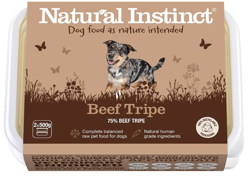 A complete food made using beef green tripe (so it's a little bit smelly!) together with our usual mix of fruit and vegetables. This recipe does not contain any bone so we add kelp to provide calcium. Dogs love tripe so this recipe is perfect for mixing with any other food to help encourage a fussy dog to eat.